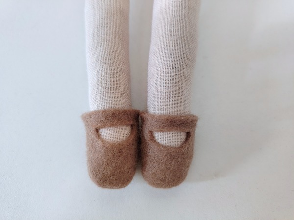 Ava has been handcrafted, over time, with love. He clothing is removable, apart from her felted woolen shoes. Her hair is created from a cotton and bamboo blended yarn.